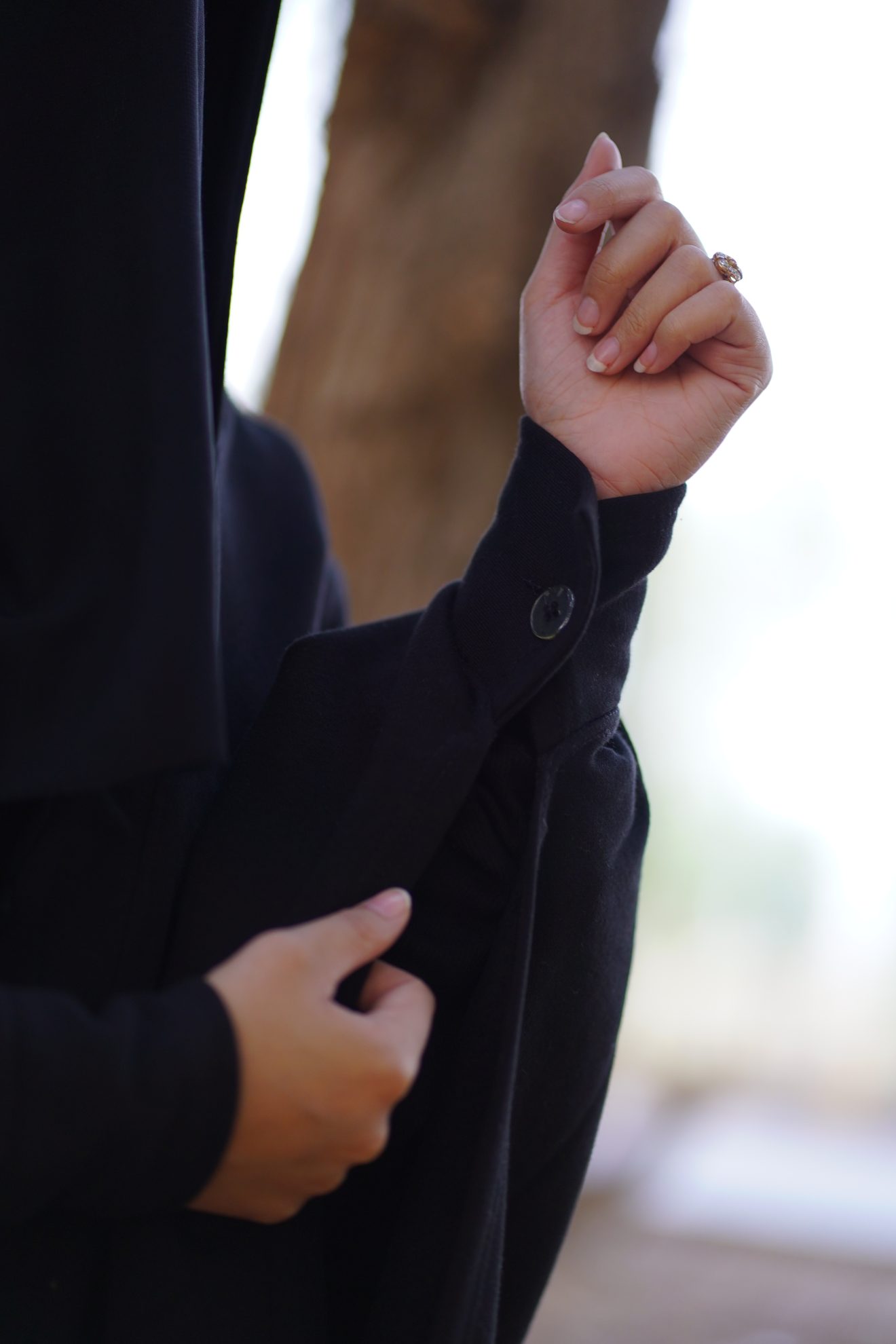 Sleeves: Button detail with an open flow