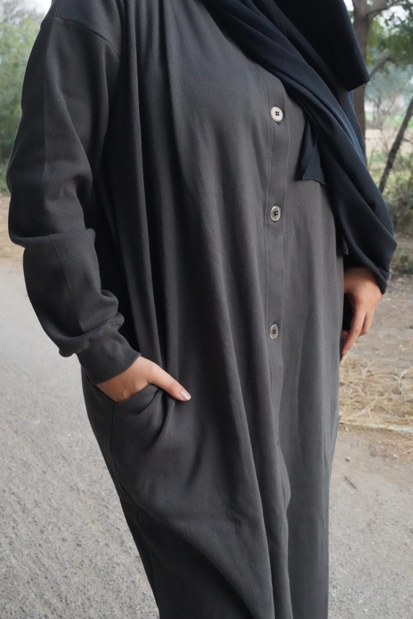 3. Knit abayas – buttoned down charcoal grey