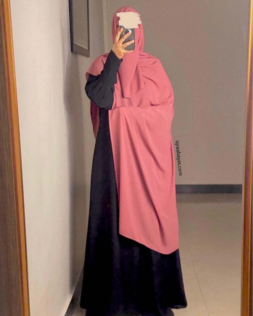 A pastel mauve abaya in textured fabric with applique sleeve accents. Elegant & summer-friendly. Hijab sold separately (mauve).