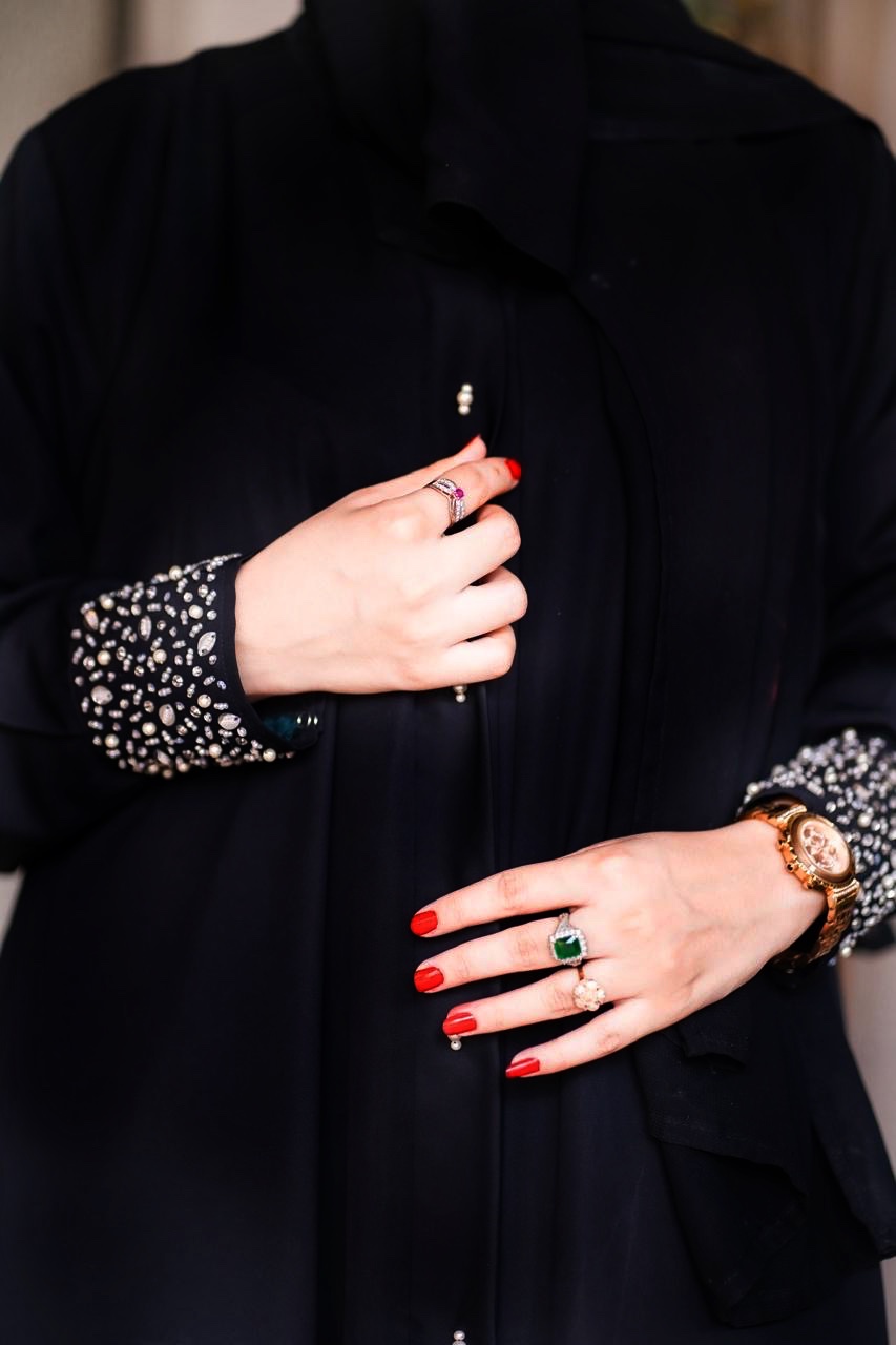 Noir Heirloom is a timeless black abaya crafted from premium Nida fabric, designed for effortless elegance. The cuffs are delicately handworked with stone embellishments, while the front button detailing is enhanced with subtle pearl accents. A versatile piece that transitions seamlessly from formal wear to refined everyday styling.