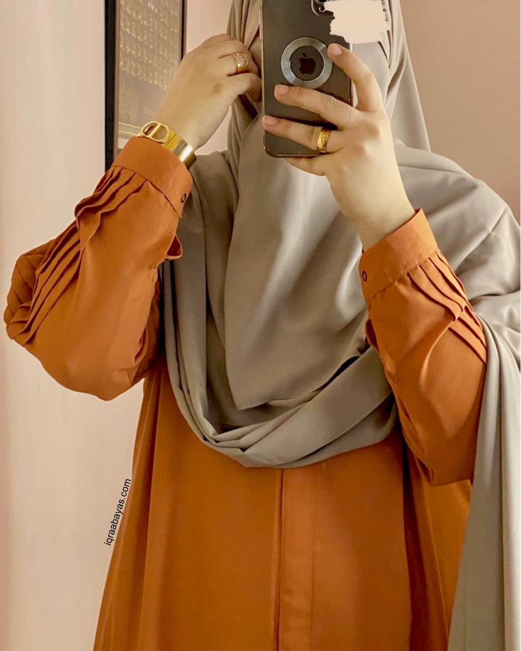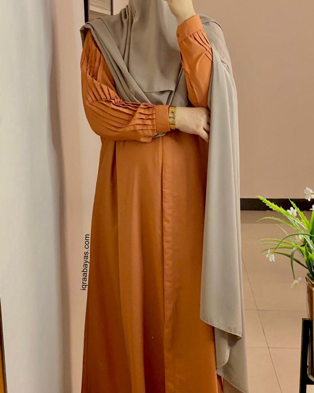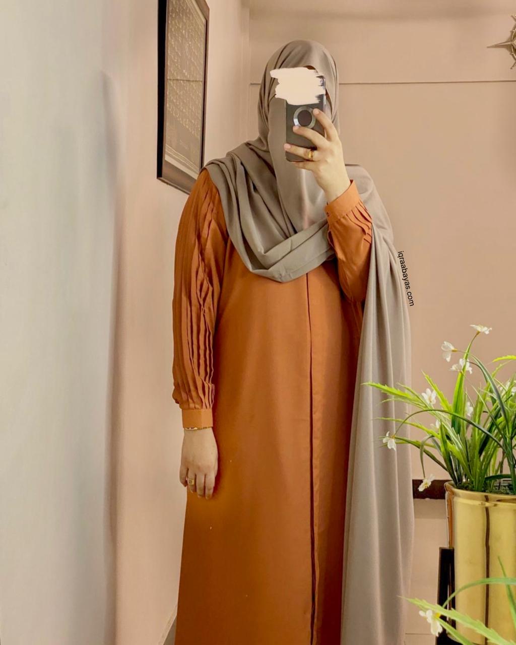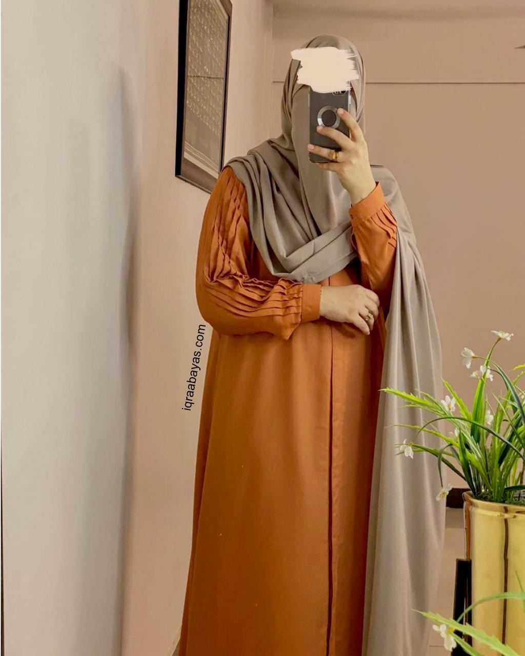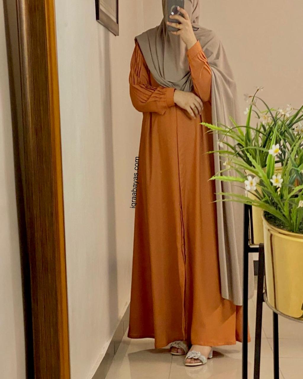 An A-line cut front open abaya made from georgette fabric typically features a flowing silhouette that tapers gently from the shoulders to the hem, with the lightweight and slightly sheer georgette fabric enhancing its fluid drape. The front opening allows for easy wear, while the band collar adds a sophisticated touch. Pleated sleeves add texture and volume, complementing the soft, airy feel of the georgette. Pockets on one side offer functionality and a modern flair. This abaya combines elegance and practicality, making it a stylish and versatile piece for contemporary modest fashion.