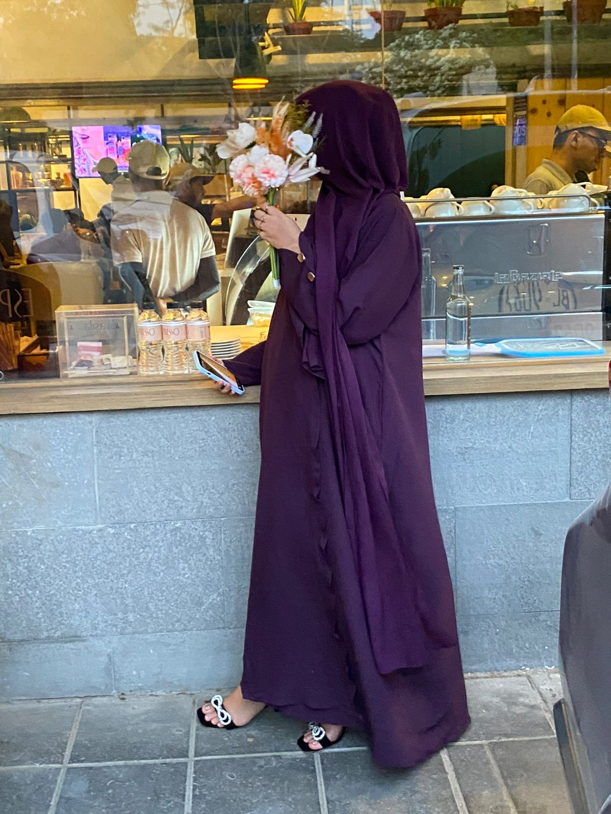 This plum abaya features a flap wrap silhouette with tie-knot and button closure. Its textured fabric makes it breathable and fully modest without the need for an inner.
